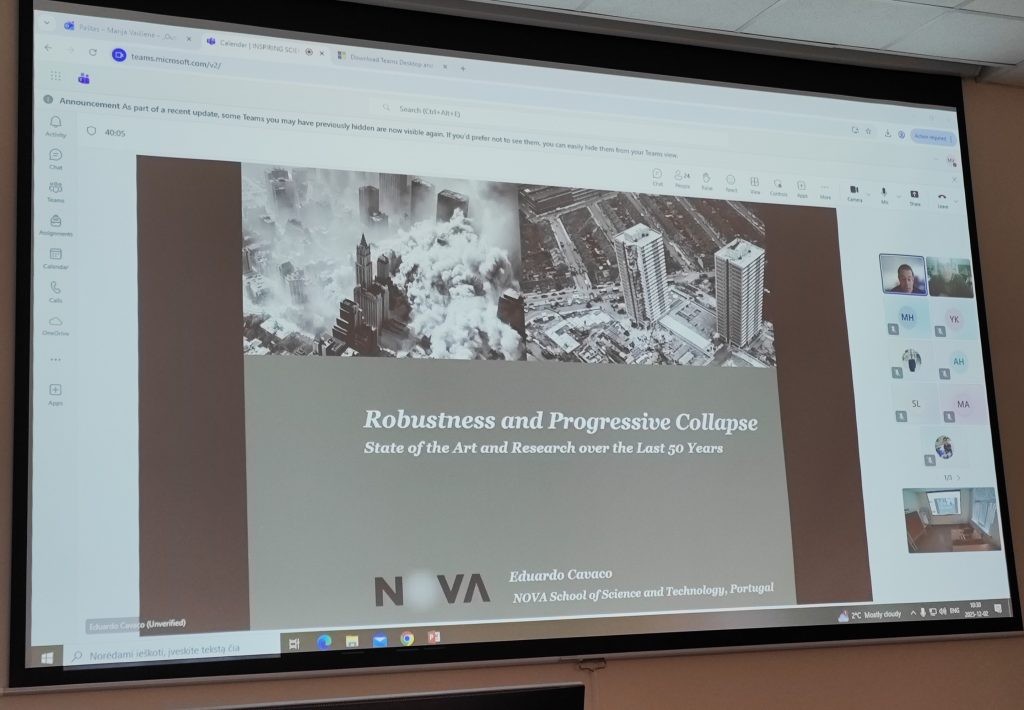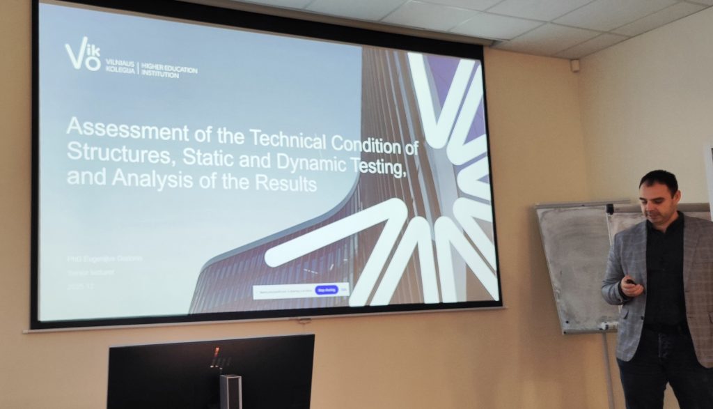 The second day of STADI’25 Science Week at the Faculty of Civil Engineering was dedicated to the event “Inspiring Science: Researchers’ Experiences,” which featured lectures by Lithuanian and foreign scientists and a poster presentation of research results. The faculty community had the opportunity to meet Dr. Eugenijus Gudonis (Vilnius College, UAB INHUS Engineering, Lithuania), Dr. Eduardo Soares Ribeiro Gomes Cavaco (NOVA University Lisbon, Portugal), Dr. Ricardo do Carmo (Polytechnic Institute of Coimbra, Portugal), Dr. António José Pedroso de Moura Correia (Polytechnic Institute of Coimbra, Portugal), and Dr. Alfons Buchmann (Mainco University of Applied Sciences, Germany). The scientists presented topical issues such as the assessment of the technical condition of structures, static and dynamic testing, strength and progressive collapse, experimental research on reinforced concrete structures, fire safety engineering, and the environmental benefits of railway systems.